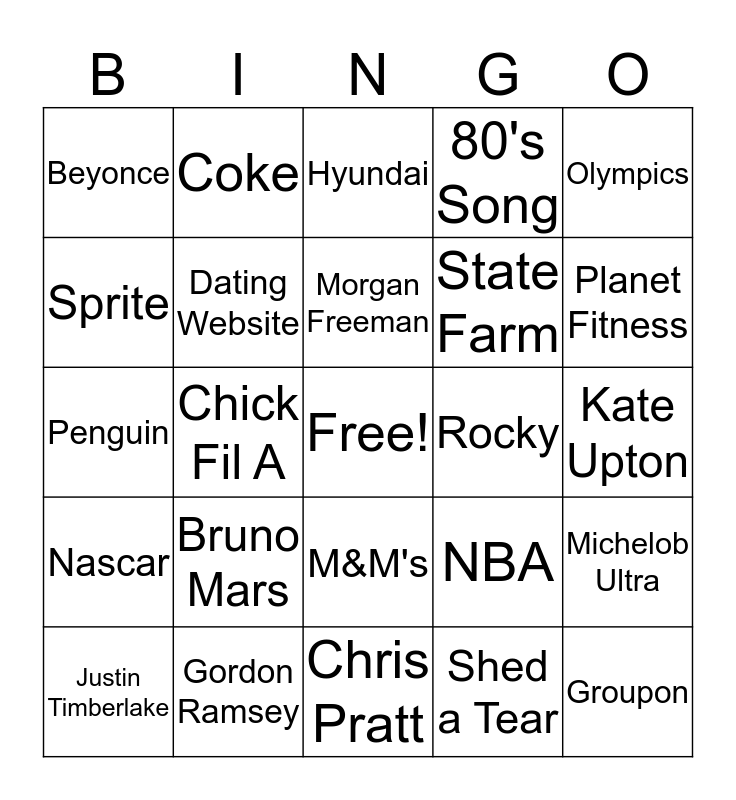 This bingo card has a free space and 88 words: Dilly Dilly, Mountain Dew, M&M's, Puppies, Pepsi, Doritos, Eminem, Turbo Tax, Keanu Reeves, Avocados, Speaking Animal, Talking Baby, Michelob Ultra, Kate Upton, American Flag, Morgan Freeman, Matt Damon, Skittles, Diamond Commercial, Black Panther, Elton John, Polar Bear, Penguin, Verizon, Shed a Tear, Belly Laugh, Lexus, Ford, Nissan, Miller Light, Hyundai, 80's Song, 90's Song, 2000''s Song, Bruno Mars, Sprite, Beyonce, The Donald, Cindy Crawford, Planet Fitness, Chick Fil A, Get Outside, Go Green, NBA, Rocky, This is Us, Stella Artois, Geico, Farmers, State Farm, Allstate, Mayhem, Google, Toothpaste, Deodorant, Pineapples, Nascar, Coke, Gillette, Stand by Me, Promoting Social Justice, Alexa, Reba Wilson, Subway, Frozen, Gordon Ramsey, The Voice, Dating Website, Justin Timberlake, Groupon, Game of Thrones, Pizza Hut, Horses, Olympics, Coffee, PETA, Pringles, Tide, Chris Pratt, Peyton Manning, Amusement Park, Amazon, Febreeze, Square Space, Martha Stewart, Sprint, Robot and Steven Tyler.