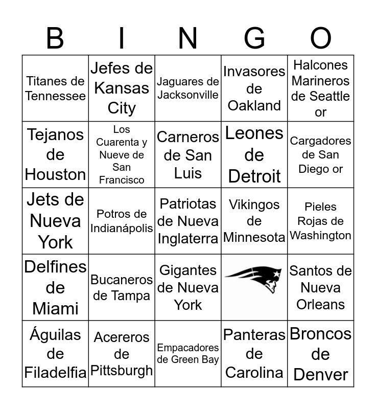 This bingo card has 1 images and 26 words: Broncos de Denver, Leones de Detroit, Empacadores de Green Bay, Tejanos de Houston, Jaguares de Jacksonville, Jefes de Kansas City, Delfines de Miami, Vikingos de Minnesota, Santos de Nueva Orleans, Jets de Nueva York, Invasores de Oakland, Águilas de Filadelfia, Acereros de Pittsburgh, Cargadores de San Diego or, Cargueros de San Diego, Los Cuarenta y Nueve de San Francisco, Carneros de San Luis, Bucaneros de Tampa, Titanes de Tennessee, Pieles Rojas de Washington, Panteras de Carolina, Potros de Indianápolis, Patriotas de Nueva Inglaterra, Gigantes de Nueva York, Halcones Marineros de Seattle or and Halcones Marinos de Seattle.