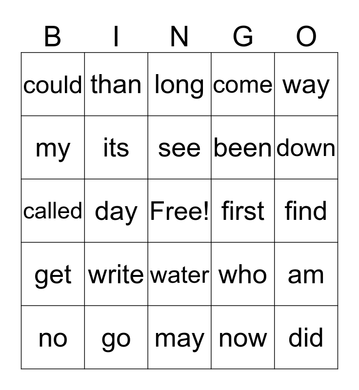 This bingo card has a free space and 24 words: write, go, see, no, way, could, my, than, first, water, been, called, who, am, its, now, find, long, down, day, did, get, come and may.