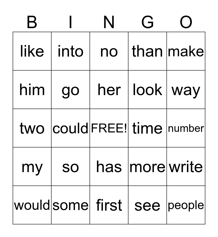 This bingo card has a free space and 24 words: so, some, her, would, make, like, him, into, time, has, look, two, more, write, go, see, number, no, way, could, people, my, than and first.