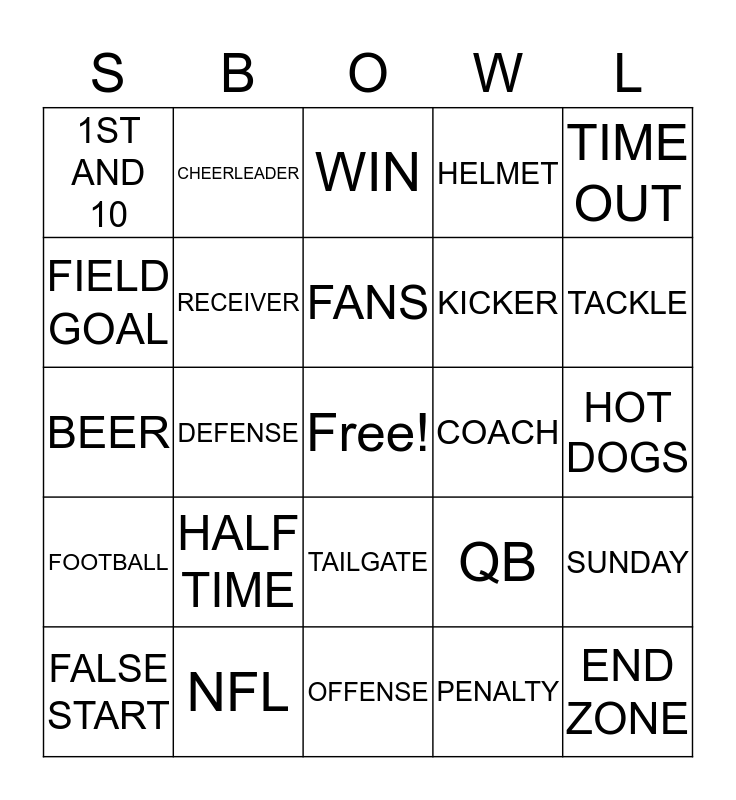 This bingo card has a free space and 24 words: FALSE START, HALF TIME, FANS, PENALTY, TIME OUT, 1ST AND 10, CHEERLEADER, WIN, COACH, HOT DOGS, BEER, RECEIVER, QB, SUNDAY, FIELD GOAL, NFL, OFFENSE, HELMET, TACKLE, FOOTBALL, DEFENSE, TAILGATE, KICKER and END ZONE.