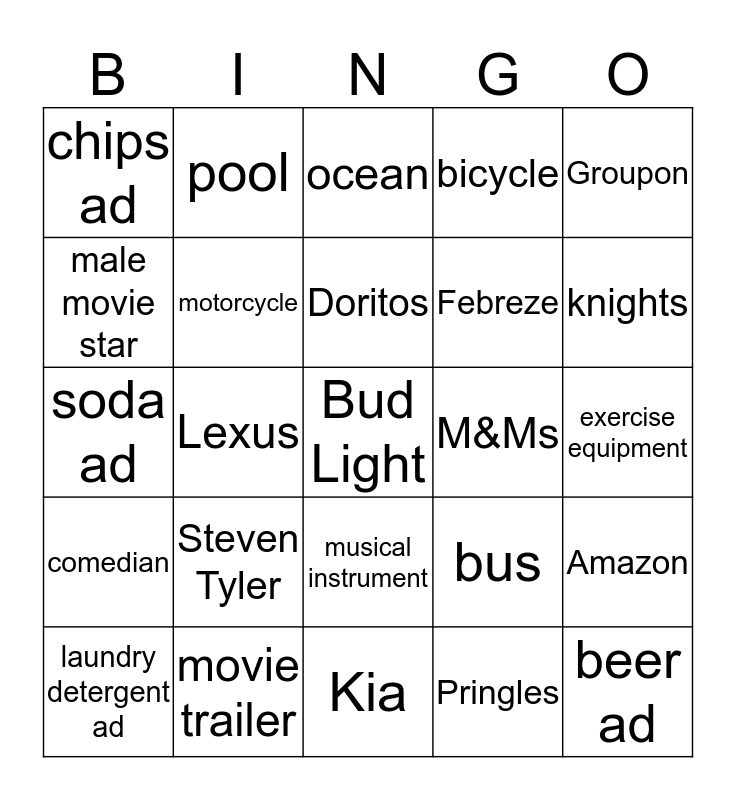 This bingo card has 52 words: Free!, Bud Light, Coca cola, Kia, Steven Tyler, Michelob Ultra, pool, Alexa, male movie star, female movie star, motorcycle, avocados, Amazon, bus, Pro athlete, Mtn Dew, Doritos, M&Ms, Budweiser, Groupon, Lexus, Pringles, chips ad, Febreze, Stella Artois, beer ad, .com/.org, horse, knights, dog, balloons, bicycle, car ad, desert, hashtag, ocean, movie trailer, people dancing, fire, Morgan Freeman, Anthony Hopkins, exercise equipment, comedian, baby, musical instrument, Toyota, cell phone ad, soda ad, fast food ad, PETA, laundry detergent ad and bathroom.