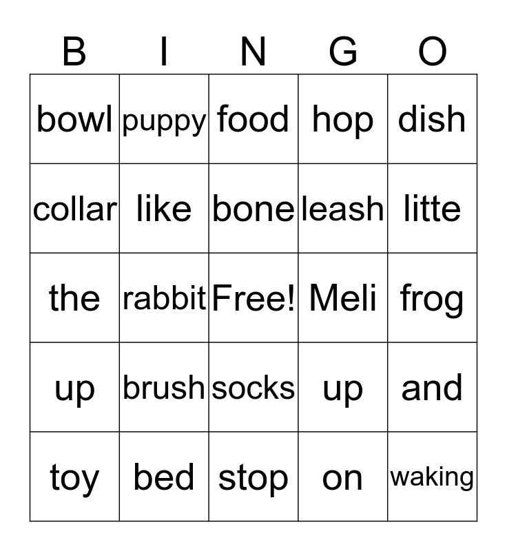 This bingo card has a free space and 24 words: brush, bed, bone, toy, dish, bowl, collar, puppy, Meli, socks, leash, the, up, and, like, on, frog, food, litte, rabbit, waking, up, hop and stop.