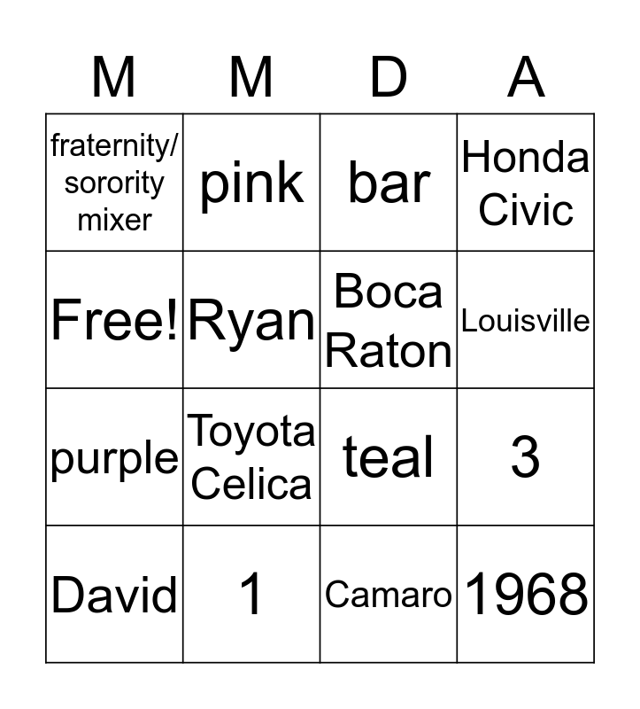 This bingo card has 16 words: 1, 3, bar, fraternity/ sorority mixer, purple, pink, teal, Camaro, Free!, Ryan, David, Honda Civic, Toyota Celica, Louisville, Boca Raton and 1968.