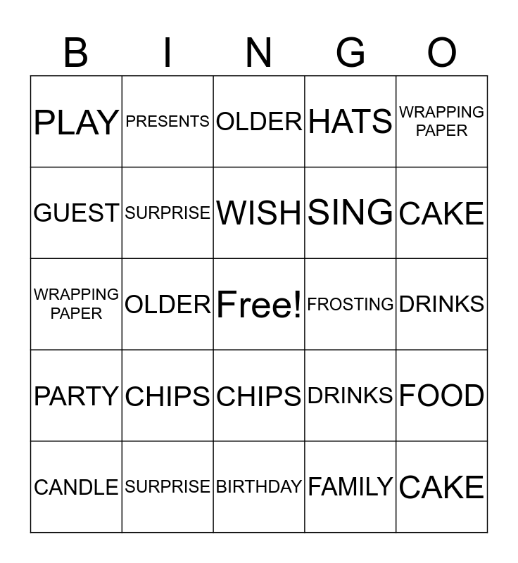 This bingo card has a free space and 49 words: HAPPY, CAKE, CANDLE, BIRTHDAY, CHIPS, PARTY, PRESENTS, GAMES, GUEST, FUN, SURPRISE, HATS, FOOD, DRINKS, STREAMER, BALLOON, WISH, FROSTING, FRIENDS, WRAPPING PAPER, OLDER, FAMILY, PLAY, SING, HAPPY, CAKE, CANDLE, BIRTHDAY, CHIPS, PARTY, PRESENTS, GAMES, GUEST, FUN, SURPRISE, HATS, FREE, FOOD, DRINKS, STREAMER, BALLOON, WISH, FROSTING, FRIENDS, WRAPPING PAPER, OLDER, FAMILY, PLAY and SING.