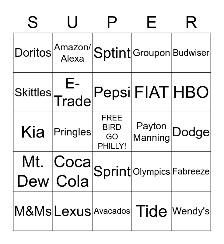 This bingo card has a free space and 24 words: M&Ms, Coca Cola, Pepsi, Tide, Budwiser, Doritos, Amazon/ Alexa, Sptint, Payton Manning, Dodge, Kia, E-Trade, Olympics, Fabreeze, Skittles, Lexus, Avacados, Groupon, HBO, Mt. Dew, Pringles, Sprint, FIAT and Wendy's.