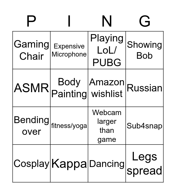 This bingo card has 16 words: Kappa, Sub4snap, Playing LoL/ PUBG, Gaming Chair, Bending over, Expensive Microphone, Webcam larger than game, Dancing, ASMR, Body Painting, Cosplay, Showing Bob, fitness/yoga, Russian, Amazon wishlist and Legs spread.