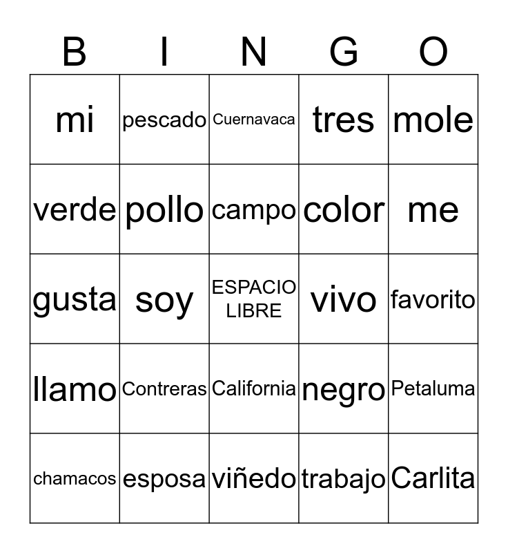 This bingo card has a free space and 24 words: Contreras, esposa, campo, chamacos, mole, mi, verde, pescado, vivo, California, color, gusta, negro, Petaluma, pollo, trabajo, favorito, Cuernavaca, me, soy, Carlita, llamo, tres and viñedo.