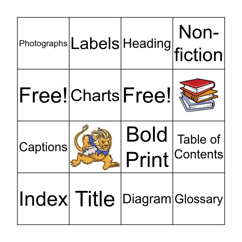 This bingo card has 2 images and 14 words: Title, Table of Contents, Heading, Photographs, Captions, Labels, Bold Print, Diagram, Free!, Charts, Index, Non-fiction, Free! and Glossary.