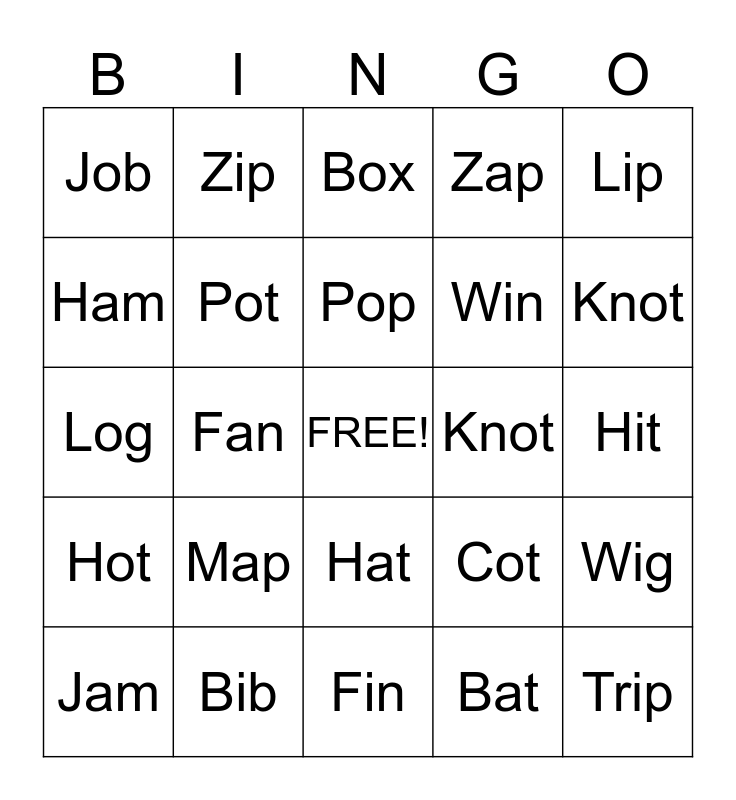 This bingo card has a free space and 24 words: Map, Bib, Pop, Jam, Lip, Job, Ham, Zip, Knot, Hat, Win, Log, Cot, Wig, Pot, Bat, Hit, Box, Knot, Fan, Trip, Hot, Zap and Fin.