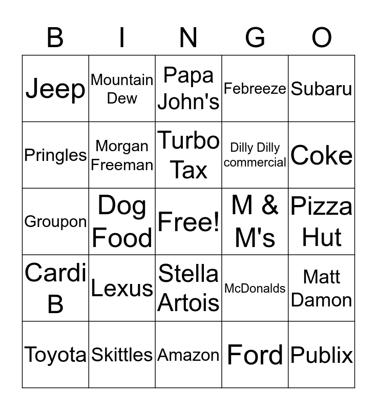 This bingo card has a free space and 24 words: Lexus, Skittles, Turbo Tax, Toyota, Subaru, Jeep, Pringles, Mountain Dew, M & M's, Stella Artois, Dilly Dilly commercial, Groupon, McDonalds, Matt Damon, Morgan Freeman, Ford, Pizza Hut, Papa John's, Coke, Dog Food, Publix, Cardi B, Febreeze and Amazon.