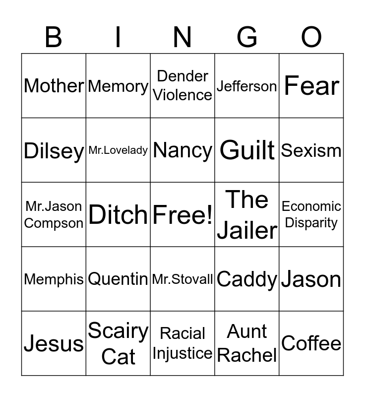 This bingo card has a free space and 25 words: Quentin, Racial Injustice, Nancy, Jesus, Fear, Mother, Dilsey, Memory, The Jailer, Mr.Stovall, Guilt, Mr.Jason Compson, Caddy, Jason, Mr.Lovelady, Versions of Reality, Economic Disparity, Dender Violence, Sexism, Ditch, Coffee, Scairy Cat, Memphis, Jefferson and Aunt Rachel.