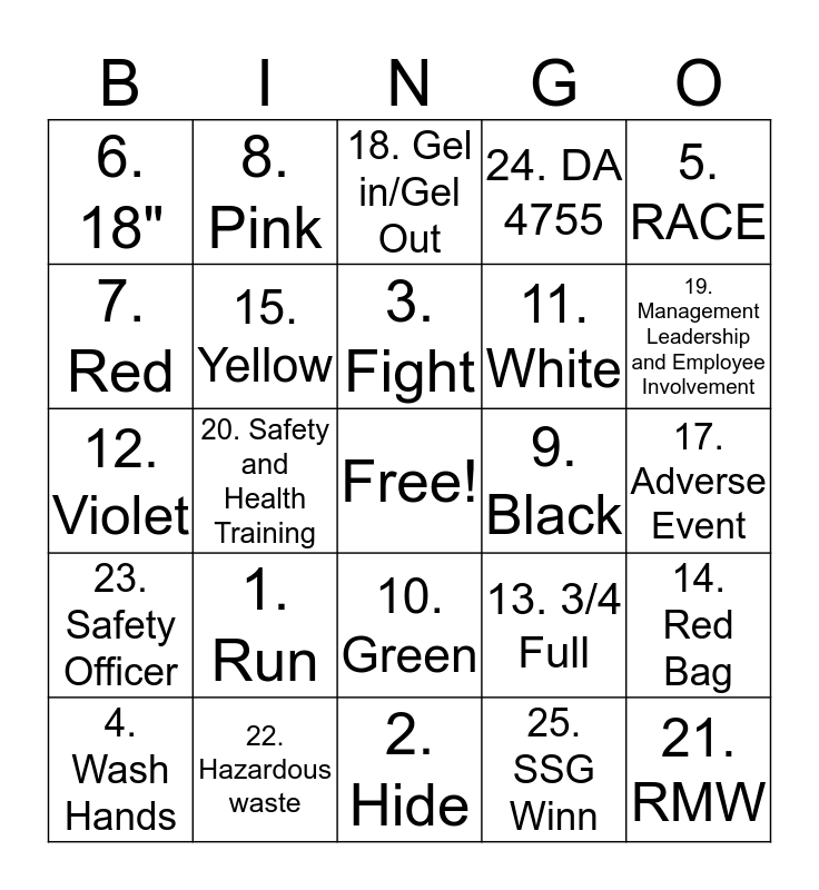 This bingo card has a free space and 25 words: 1. Run, 2. Hide, 3. Fight, 4. Wash Hands, 5. RACE, 6. 18", 7. Red, 8. Pink, 9. Black, 10. Green, 11. White, 12. Violet, 13. 3/4 Full, 14. Red Bag, 15. Yellow, 16. Near Miss, 17. Adverse Event, 18. Gel in/Gel Out, 19. Management Leadership and Employee Involvement, 20. Safety and Health Training, 21. RMW, 22. Hazardous waste, 23. Safety Officer, 24. DA 4755 and 25. SSG Winn.