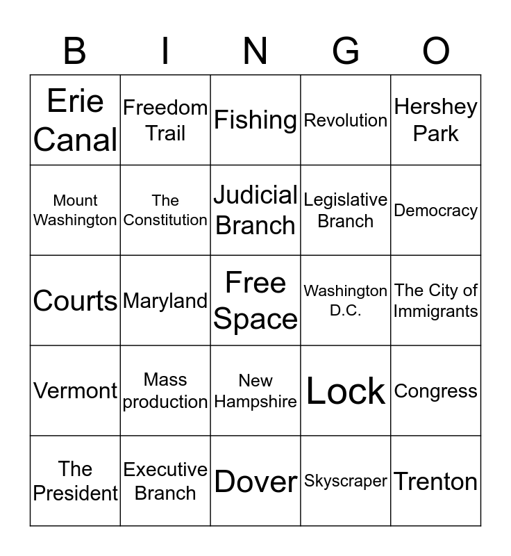 This bingo card has a free space and 24 words: Mass production, Executive Branch, Judicial Branch, The President, Hershey Park, Erie Canal, Mount Washington, Freedom Trail, Washington D.C., New Hampshire, Legislative Branch, Courts, Lock, Congress, The Constitution, Skyscraper, The City of Immigrants, Fishing, Democracy, Maryland, Trenton, Vermont, Revolution and Dover.
