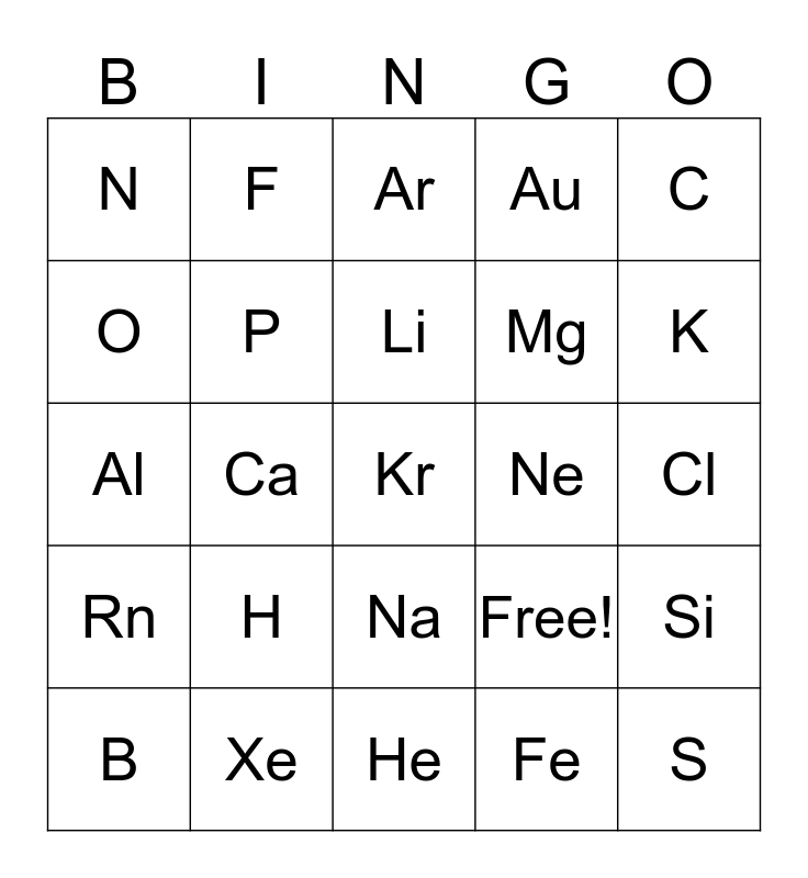 This bingo card has 25 words: H, He, Li, B, C, N, O, F, Ne, Na, Mg, Al, Free!, Si, P, S, Cl, Ar, K, Ca, Kr, Xe, Rn, Au and Fe.