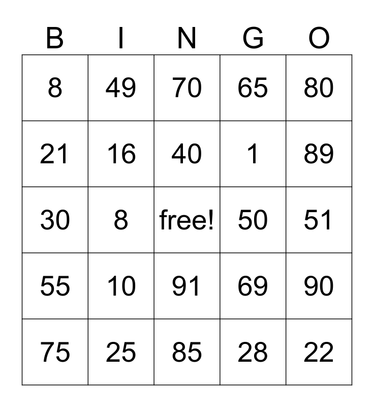 This bingo card has a free space and 24 words: 10, 25, 40, 75, 80, 8, 21, 49, 50, 91, 1, 30, 69, 90, 16, 28, 51, 70, 89, 8, 22, 55, 65 and 85.