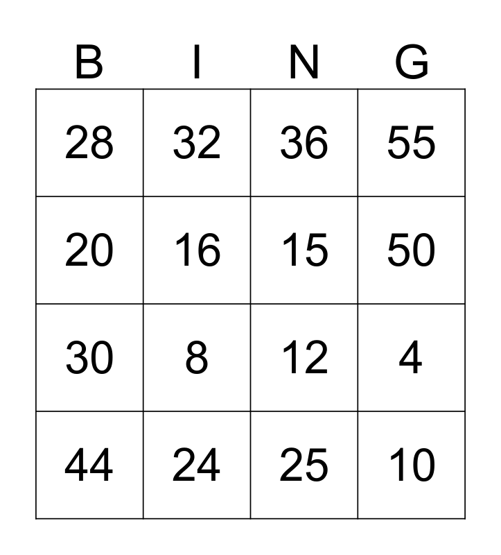 This bingo card has 20 words: 4, 5, 36, 40, 44, 20, 24, 28, 30, 32, 8, 12, 16, 10, 15, 45, 50, 55, 25 and 35.