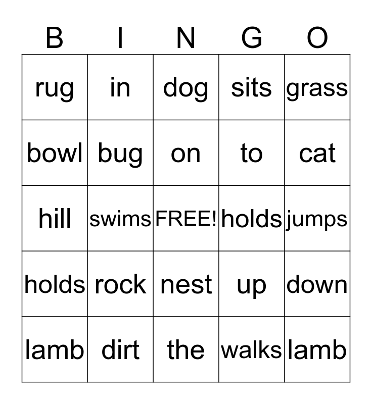 This bingo card has a free space and 24 words: rock, dirt, on, lamb, grass, rug, bowl, in, holds, nest, to, hill, up, down, bug, walks, jumps, dog, cat, swims, lamb, holds, sits and the.