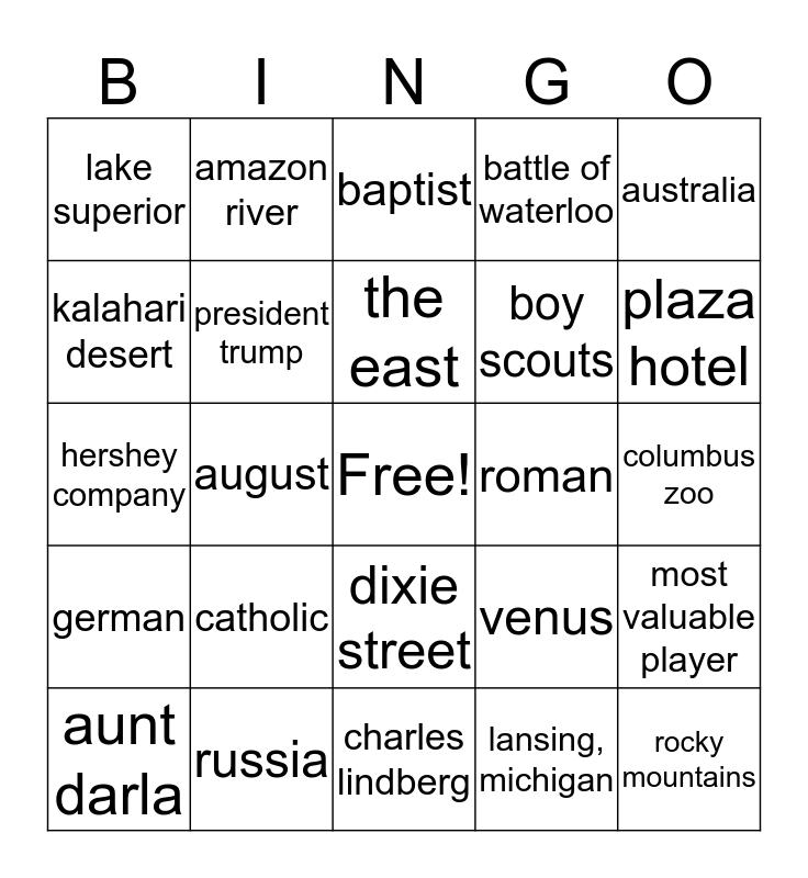 This bingo card has a free space and 26 words: dixie street, lansing, michigan, the east, russia, australia, lake superior, kalahari desert, amazon river, columbus zoo, venus, boy scouts, hershey company, most valuable player, aunt darla, august, valentine’s day, battle of waterloo, german, baptist, rocky mountains, plaza hotel, charles lindberg, roman, catholic, president trump and the titanic.