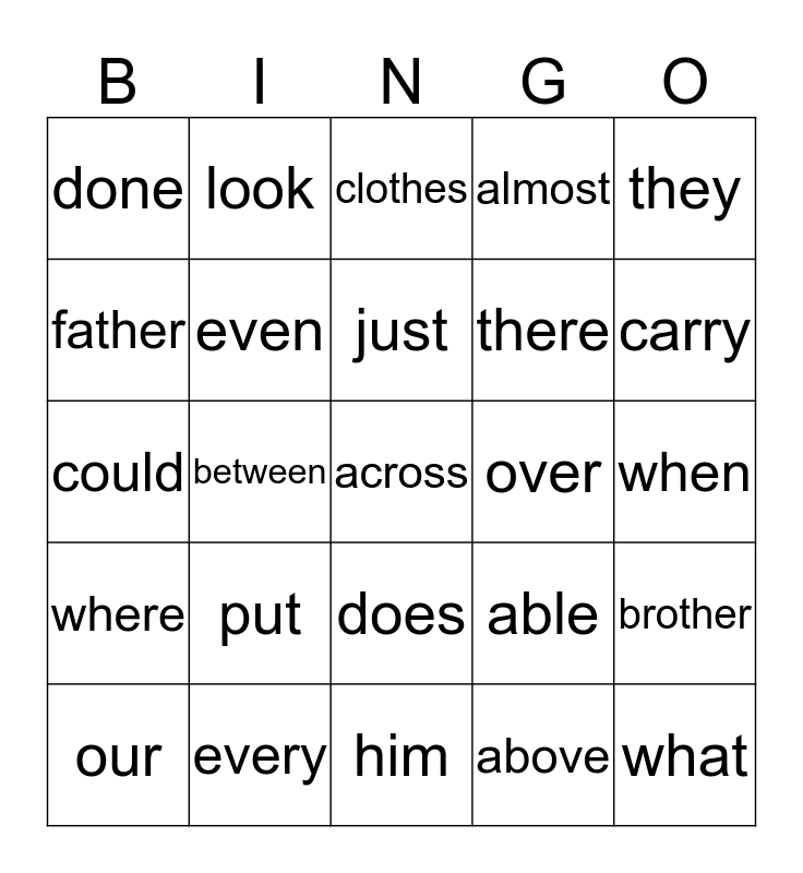 This bingo card has 25 words: put, him, just, our, they, done, father, look, over, does, there, could, able, brother, even, what, when, clothes, carry, between, across, every, where, almost and above.