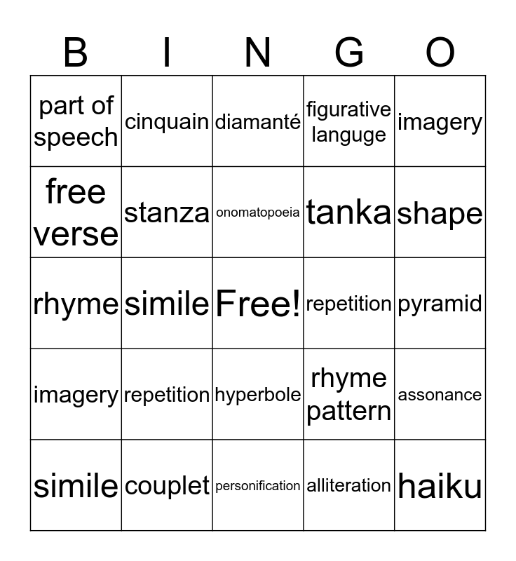 This bingo card has a free space and 24 words: repetition, couplet, onomatopoeia, simile, imagery, part of speech, free verse, cinquain, repetition, hyperbole, tanka, rhyme, rhyme pattern, assonance, stanza, alliteration, pyramid, diamanté, shape, simile, haiku, imagery, figurative languge and personification.