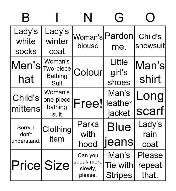This bingo card has a free space and 24 words: Clothing item, Size, Colour, Price, Child's snowsuit, Lady's white socks, Men's hat, Lady's winter coat, Man's leather jacket, Parka with hood, Little girl's shoes, Child's mittens, Blue jeans, Lady's rain coat, Woman's Two-piece Bathing Suit, Man's Tie with Stripes, Long scarf, Woman's blouse, Man's shirt, Woman's one-piece bathing suit, Please repeat that., Sorry, I don't understand., Pardon me. and Can you speak more slowly, please..