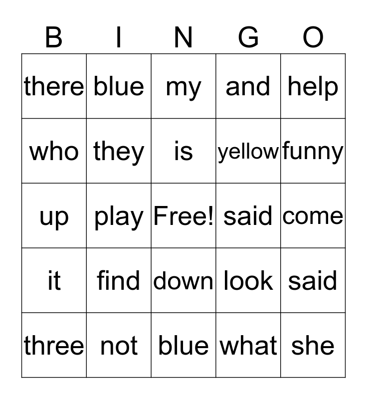 This bingo card has a free space and 24 words: find, not, is, three, help, there, who, blue, said, down, yellow, up, look, said, they, what, come, my, funny, play, she, it, and and blue.