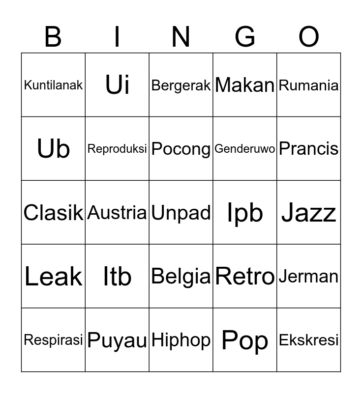 This bingo card has a free space and 24 words: Respirasi, Itb, Pocong, Pop, Rumania, Kuntilanak, Ui, Bergerak, Ipb, Jazz, Clasik, Reproduksi, Retro, Jerman, Ub, Puyau, Hiphop, Makan, Prancis, Leak, Austria, Belgia, Genderuwo and Ekskresi.