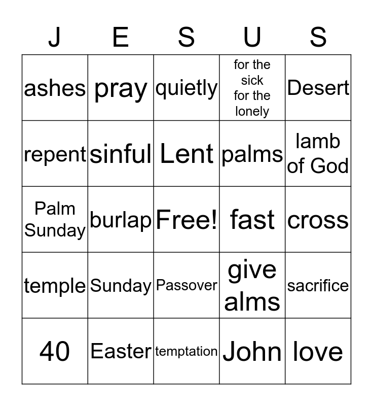 This bingo card has a free space and 24 words: Sunday, Easter, Lent, 40, Desert, ashes, repent, pray, fast, Passover, palms, Palm Sunday, give alms, sacrifice, sinful, John, cross, quietly, lamb of God, burlap, love, temple, for the sick for the lonely and temptation.