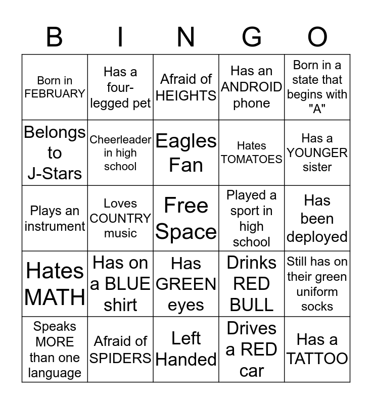 This bingo card has a free space and 24 words: Has on a BLUE shirt, Afraid of SPIDERS, Eagles Fan, Speaks MORE than one language, Born in a state that begins with "A", Born in FEBRUARY, Belongs to J-Stars, Has a four-legged pet, Played a sport in high school, Has GREEN eyes, Hates TOMATOES, Plays an instrument, Drinks RED BULL, Still has on their green uniform socks, Cheerleader in high school, Drives a RED car, Has been deployed, Afraid of HEIGHTS, Has a YOUNGER sister, Loves COUNTRY music, Has a TATTOO, Hates MATH, Has an ANDROID phone and Left Handed.