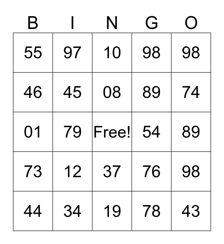 This bingo card has a free space and 24 words: 12, 34, 08, 44, 98, 55, 46, 97, 54, 37, 89, 01, 76, 98, 45, 78, 89, 10, 74, 79, 43, 73, 98 and 19.