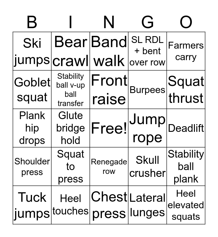 This bingo card has a free space and 24 words: Tuck jumps, Squat to press, Front raise, Lateral lunges, Farmers carry, Ski jumps, Bear crawl, Band walk, Jump rope, Deadlift, Plank hip drops, Stability ball v-up ball transfer, Skull crusher, Stability ball plank, Goblet squat, Heel touches, Chest press, SL RDL + bent over row, Squat thrust, Shoulder press, Glute bridge hold, Renegade row, Burpees and Heel elevated squats.