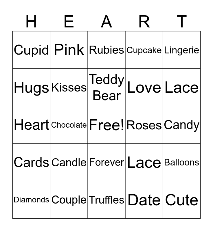 This bingo card has a free space and 24 words: Candle, Couple, Teddy Bear, Diamonds, Lingerie, Cupid, Hugs, Pink, Roses, Forever, Love, Heart, Lace, Balloons, Kisses, Date, Candy, Rubies, Lace, Chocolate, Cute, Cards, Cupcake and Truffles.