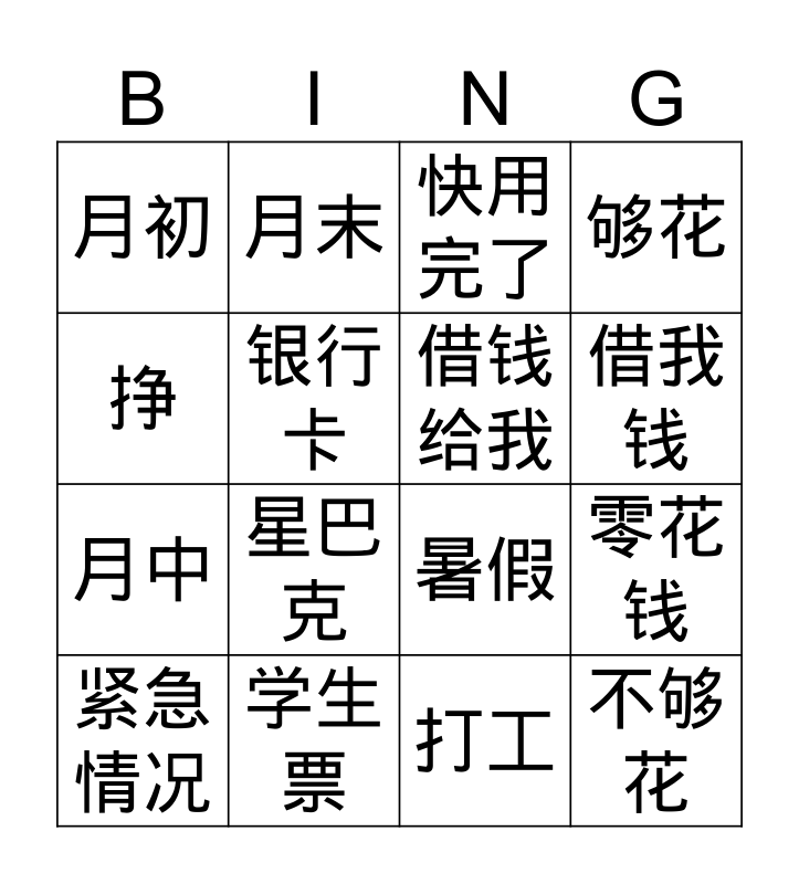 This bingo card has 16 words: 学生票, 零花钱, 快用完了, 月初, 月中, 月末, 暑假, 打工, 挣, 银行卡, 紧急情况, 够花, 星巴克, 借我钱, 借钱给我 and 不够花.