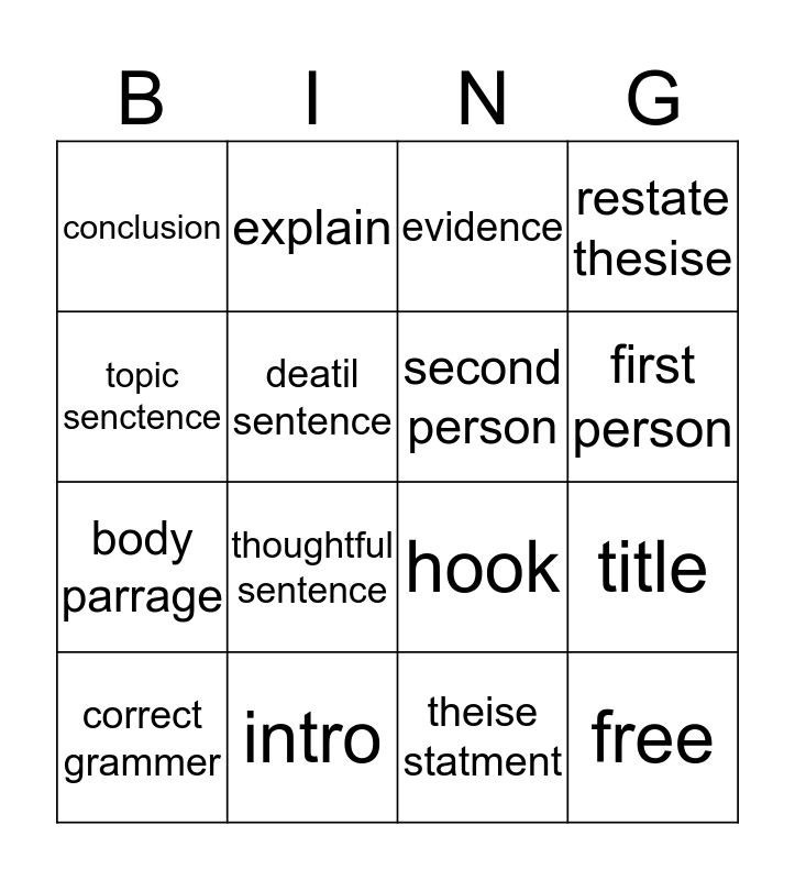 This bingo card has 16 words: intro, title, evidence, conclusion, body parrage, explain, hook, theise statment, topic senctence, deatil sentence, correct grammer, restate thesise, thoughtful sentence, first person, second person and free.