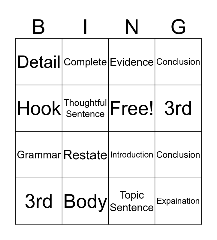 This bingo card has 19 words: Introduction, Thesis, Evidence, Expaination, Conclusion, Hook, Topic Sentence, Detail, Complete, Grammar, Restate, Thoughtful Sentence, Free!, Body, 3rd, 1st, Conclusion, 3rd and Restate.