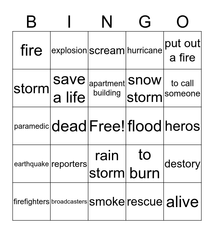 This bingo card has a free space and 24 words: reporters, broadcasters, apartment building, firefighters, put out a fire, fire, storm, explosion, flood, rain storm, snow storm, paramedic, to burn, destory, save a life, rescue, heros, scream, to call someone, dead, alive, earthquake, hurricane and smoke.