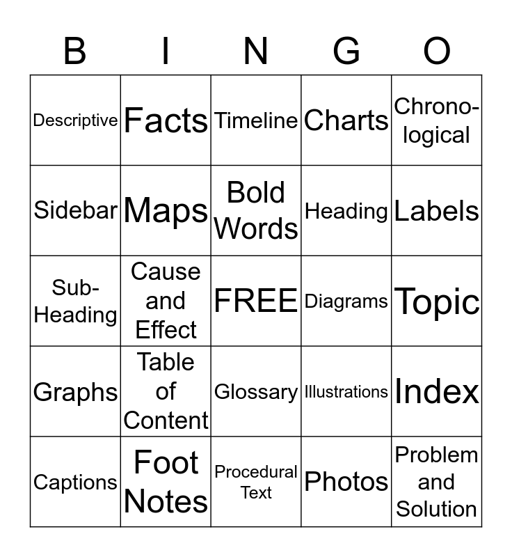 This bingo card has a free space and 24 words: Table of Content, Foot Notes, Bold Words, Captions, Chrono- logical, Descriptive, Sidebar, Facts, Diagrams, Glossary, Heading, Sub- Heading, Illustrations, Index, Maps, Photos, Topic, Timeline, Labels, Cause and Effect, Problem and Solution, Graphs, Charts and Procedural Text.
