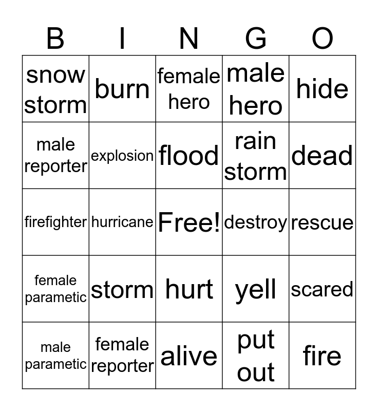 This bingo card has a free space and 24 words: storm, female reporter, flood, male parametic, hide, snow storm, male reporter, burn, destroy, hurt, rain storm, firefighter, yell, scared, explosion, put out, rescue, female hero, dead, hurricane, fire, female parametic, male hero and alive.