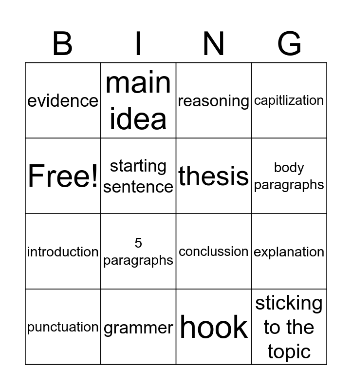 This bingo card has 16 words: grammer, explanation, reasoning, evidence, introduction, main idea, conclussion, hook, Free!, starting sentence, punctuation, capitlization, 5 paragraphs, body paragraphs, thesis and sticking to the topic.