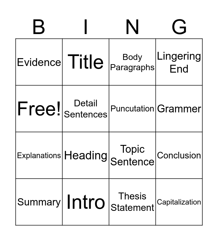 This bingo card has 16 words: Intro, Conclusion, Body Paragraphs, Evidence, Explanations, Title, Topic Sentence, Thesis Statement, Free!, Detail Sentences, Summary, Lingering End, Heading, Grammer, Puncutation and Capitalization.