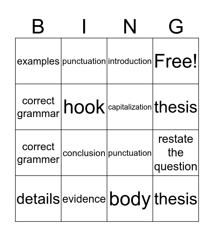 This bingo card has 17 words: body, details, introduction, examples, conclusion, Free!, restate the question, capitalization, thesis, hook, evidence, punctuation, correct grammar, punctuation, correct grammer, capitalization and thesis.