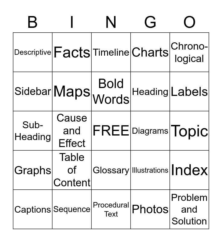 This bingo card has a free space and 24 words: Table of Content, Sequence, Bold Words, Captions, Chrono- logical, Descriptive, Sidebar, Facts, Diagrams, Glossary, Heading, Sub- Heading, Illustrations, Index, Maps, Photos, Topic, Timeline, Labels, Cause and Effect, Problem and Solution, Graphs, Charts and Procedural Text.