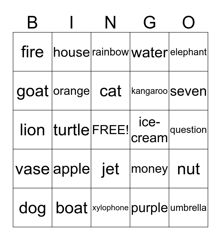 This bingo card has a free space and 24 words: apple, boat, cat, dog, elephant, fire, goat, house, ice-cream, jet, kangaroo, lion, money, nut, orange, purple, question, rainbow, seven, turtle, umbrella, vase, water and xylophone.