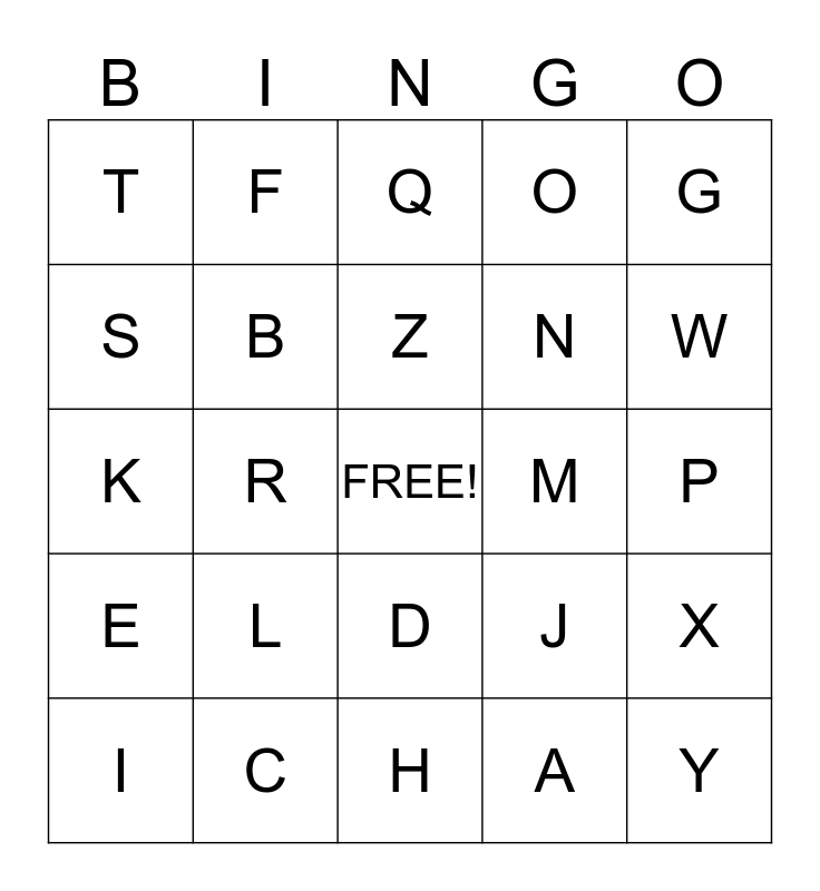 This bingo card has a free space and 24 words: L, C, Z, I, G, T, S, F, M, D, N, K, J, X, B, A, P, Q, W, R, Y, E, O and H.