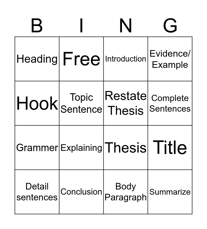 This bingo card has 16 words: Conclusion, Title, Introduction, Heading, Grammer, Free, Thesis, Body Paragraph, Hook, Topic Sentence, Detail sentences, Evidence/ Example, Explaining, Complete Sentences, Restate Thesis and Summarize.