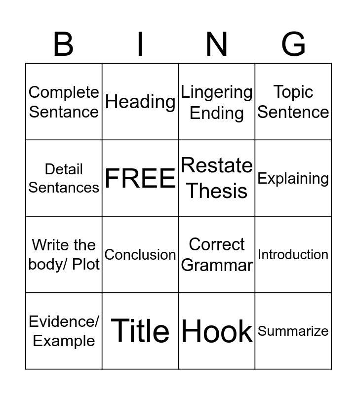 This bingo card has 16 words: Title, Introduction, Lingering Ending, Complete Sentance, Write the body/ Plot, Heading, Correct Grammar, Hook, Detail Sentances, FREE, Evidence/ Example, Topic Sentence, Conclusion, Explaining, Restate Thesis and Summarize.