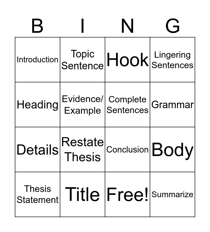 This bingo card has 16 words: Title, Body, Hook, Introduction, Details, Topic Sentence, Conclusion, Free!, Heading, Evidence/ Example, Thesis Statement, Lingering Sentences, Restate Thesis, Grammar, Complete Sentences and Summarize.