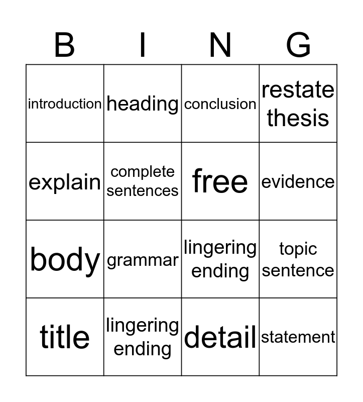 This bingo card has 18 words: grammar, statement, conclusion, introduction, lingering ending, restate thesis, title, heading, evidence, body, detail, explain, topic sentence, complete sentences, free, summarize, lingering ending and detail.