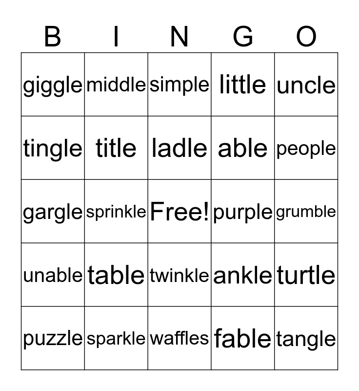This bingo card has a free space and 24 words: table, sparkle, ladle, puzzle, uncle, giggle, tingle, middle, purple, twinkle, able, gargle, ankle, turtle, title, fable, grumble, simple, people, sprinkle, tangle, unable, little and waffles.
